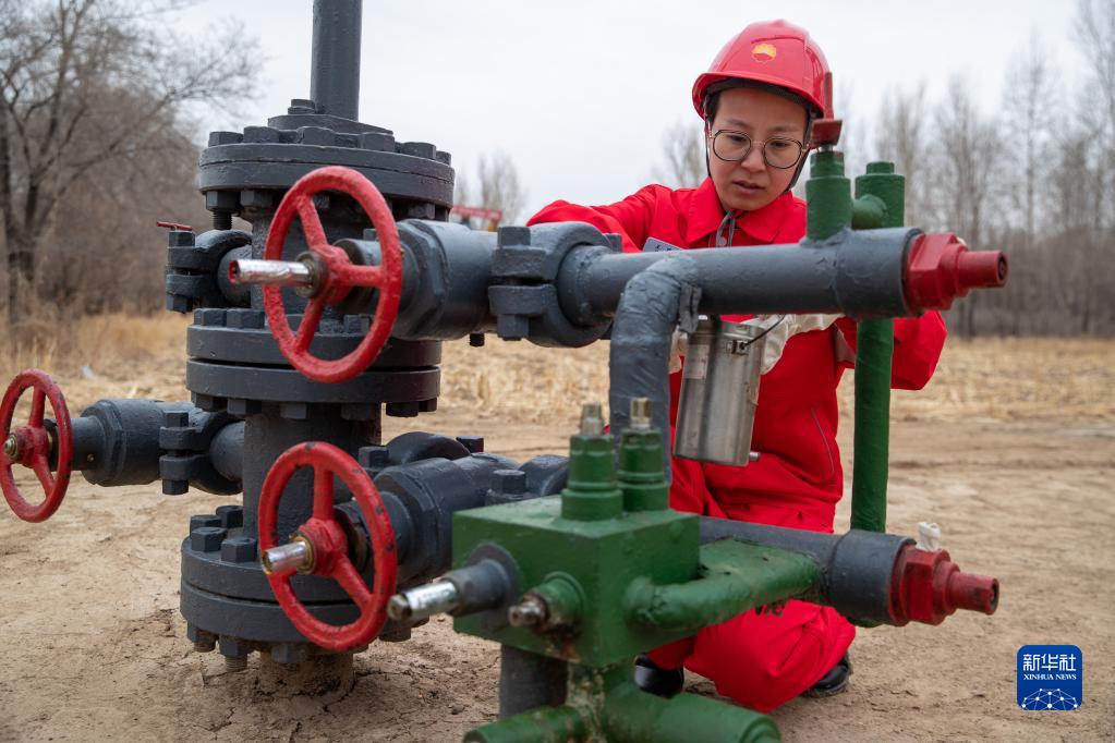 3月7日,在大庆油田第四采油厂第一作业区,北六队采油工王瑀琦在抽油机井井口抽取油样。