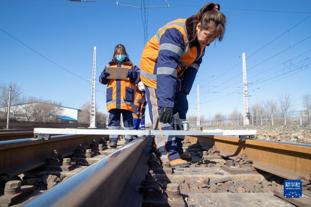 3月6日,大庆工务段杜尔伯特线路车间女子检验班班长曹蕊在滨洲线199公里处作业。
