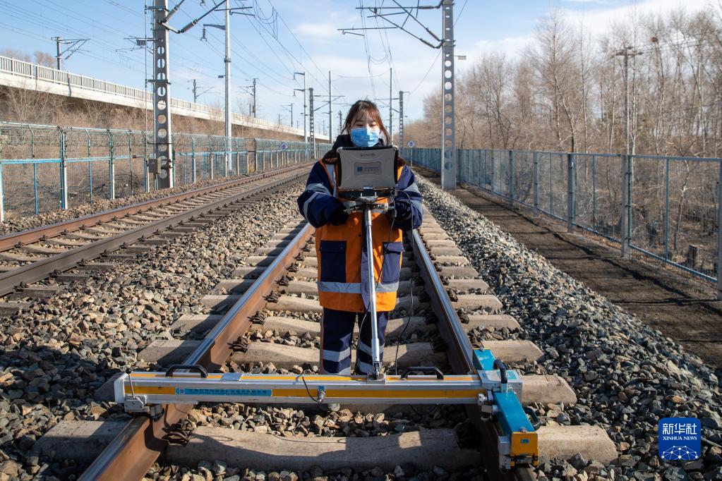 3月6日,大庆工务段杜尔伯特线路车间女子检验班的苑鹏鹏在滨洲线199公里处作业。