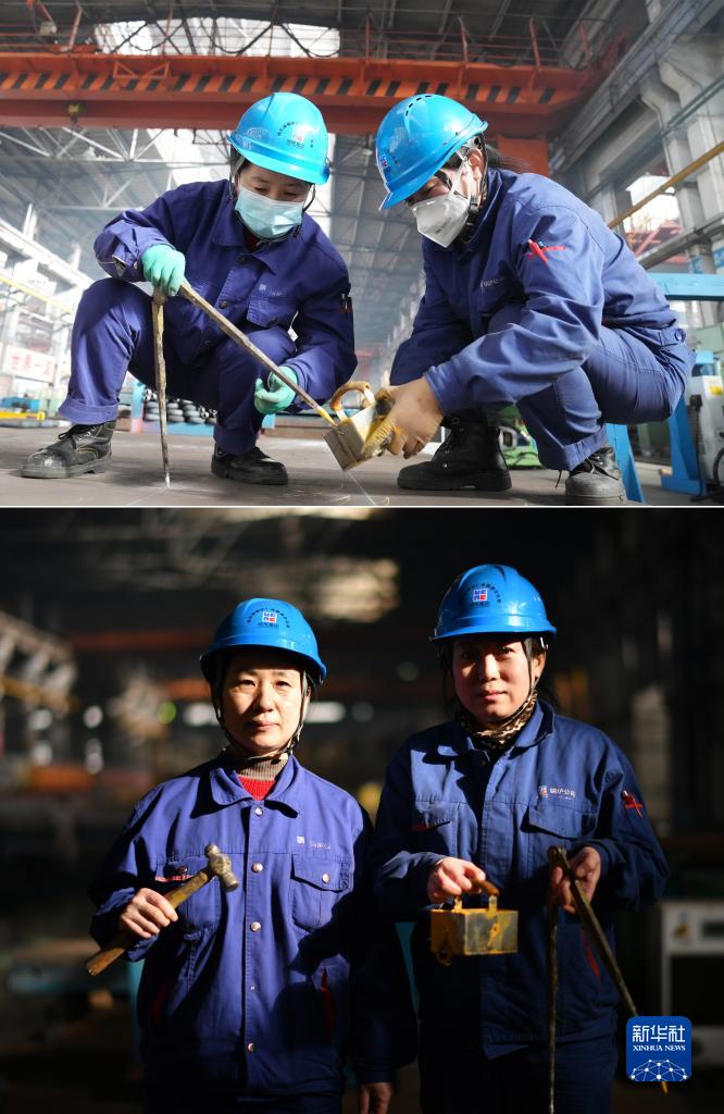 拼版照片:上图为哈电集团哈尔滨锅炉厂有限责任公司划线工刘历(左)和刘莉莉在作业中;下图为刘历(左)和刘莉莉在生产车间(3月6日摄)。