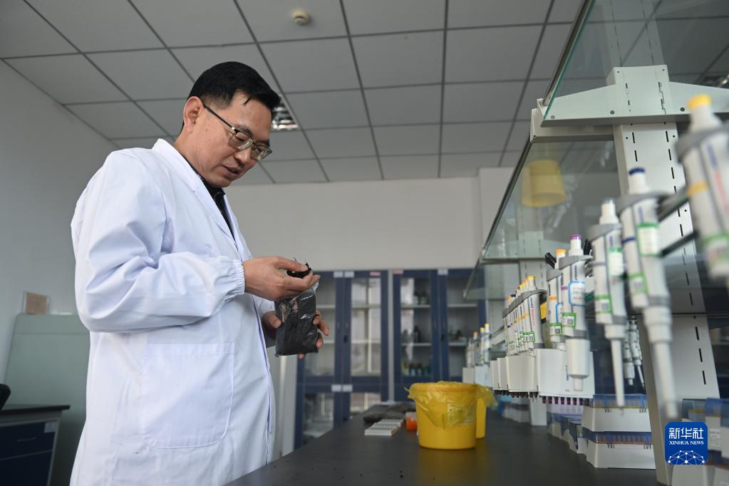 2月24日,在位于青海省海北藏族自治州的青海省高寒草地适应性管理重点实验室,董全民在查看土壤样本。