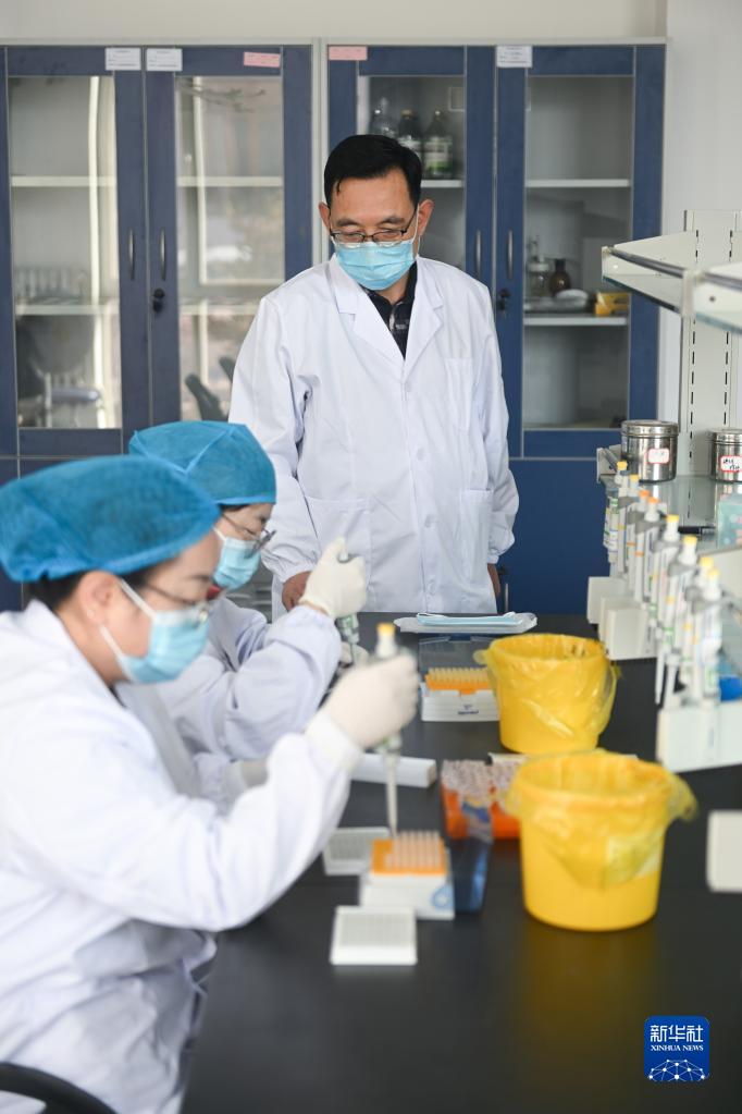 2月24日,在位于青海省海北藏族自治州的青海省高寒草地适应性管理重点实验室,董全民(右一)在指导科研人员做实验。