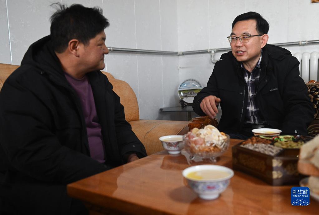 2月24日,在青海省海北藏族自治州海晏县青海湖乡达玉日秀村,董全民(右)与牧民东知布交流。