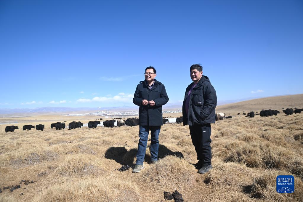 2月24日,在青海省海北藏族自治州海晏县青海湖乡达玉日秀村,董全民(左)查看牧民东知布家的草场。