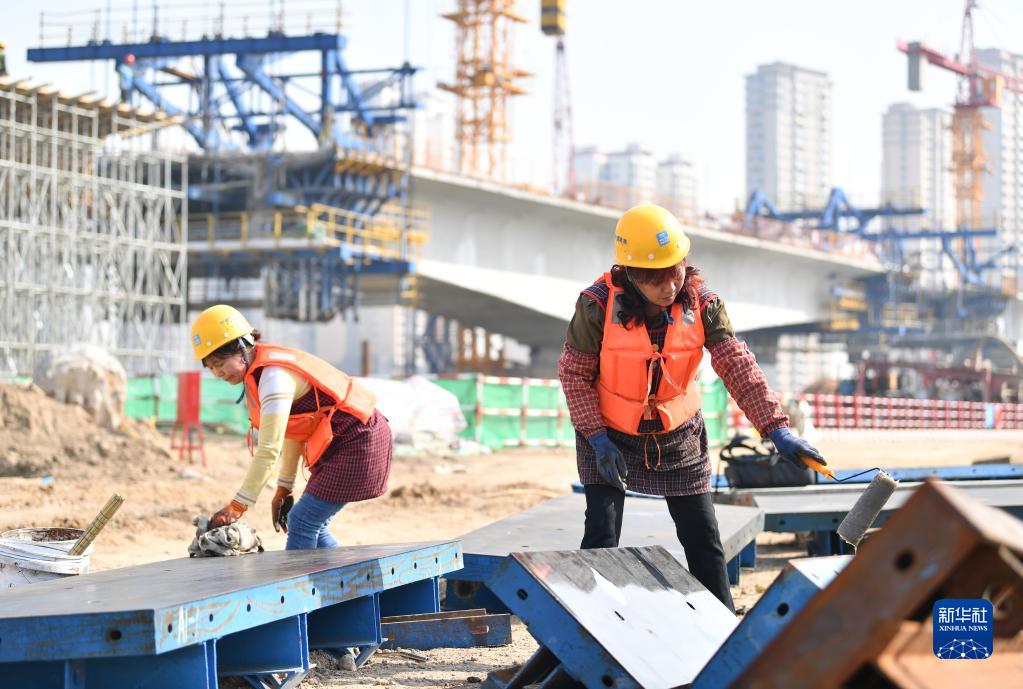 3月8日,在位于陕西省西安市国际港务区的水流路跨灞河大桥项目施工现场,中建三局西北公司模板工赵菊华(左)、汪仕英在施工现场工作。