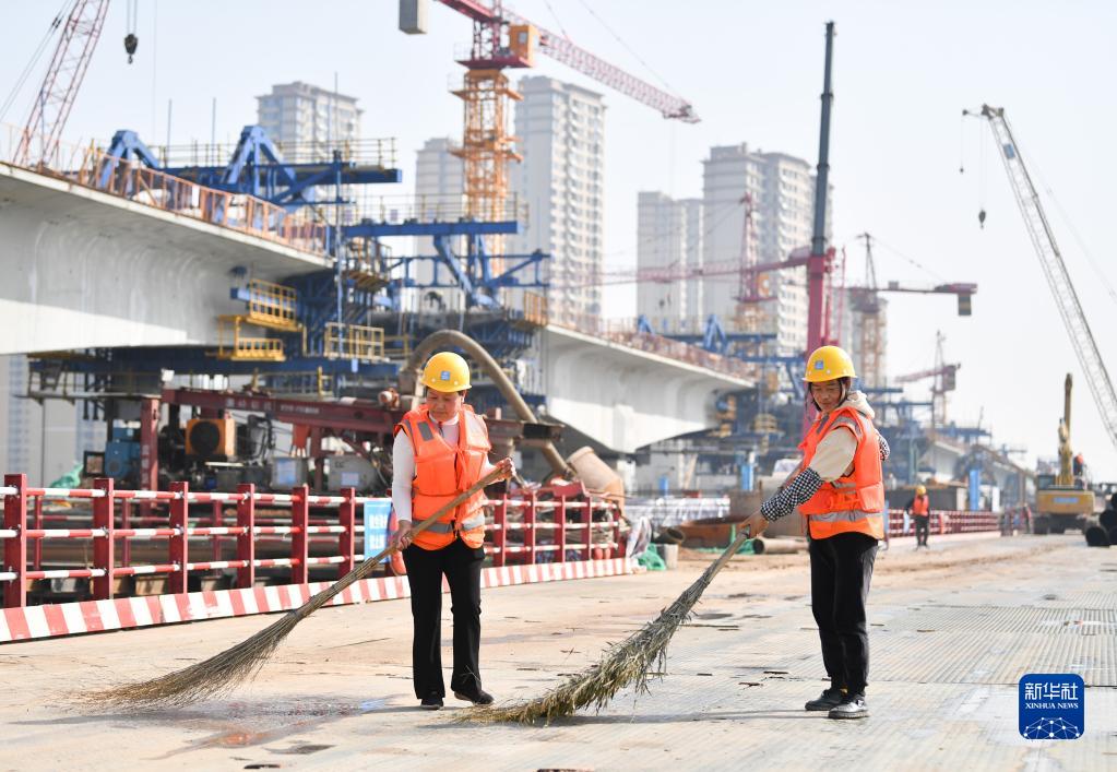 3月8日,在位于陕西省西安市国际港务区的水流路跨灞河大桥项目施工现场,中建三局西北公司工人田小叶(左)、刘雪琴在施工现场工作。