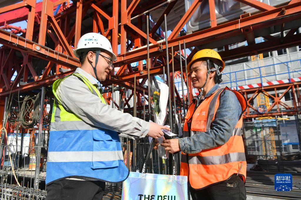 3月8日,在陕西省西安市未央区一处建筑工地,中建三局西北公司钢筋工贾元会(右)收到项目管理人员赠送的节日礼品。