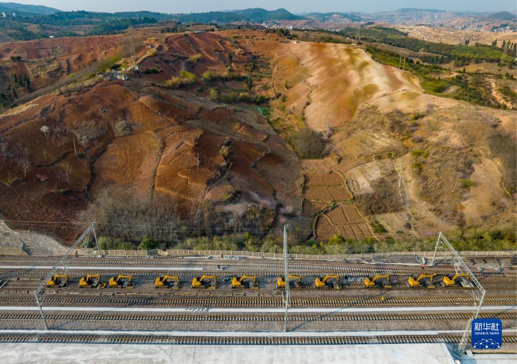 新型换枕设备完成换枕作业后准备离开(3月8日摄,无人机照片)。
