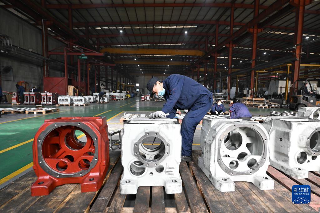 在天津市一家科技公司,工人在生产车间内对风电组件加工作业(3月8日摄)。