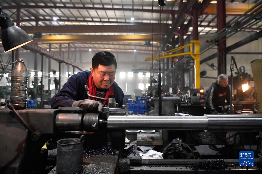 在天津市一家科技公司,工人操作车床加工风电机组部件(3月8日摄)。