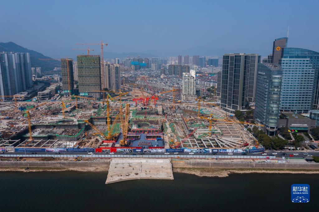 空中俯瞰富春江畔秦望通道工程过江隧道江北工作井施工现场(3月9日摄,无人机照片)。