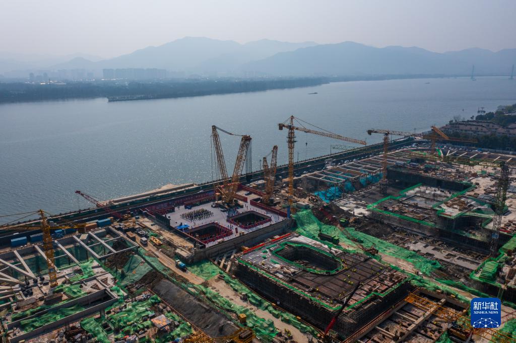 空中俯瞰富春江畔秦望通道工程过江隧道江北工作井施工现场(3月9日摄,无人机照片)。