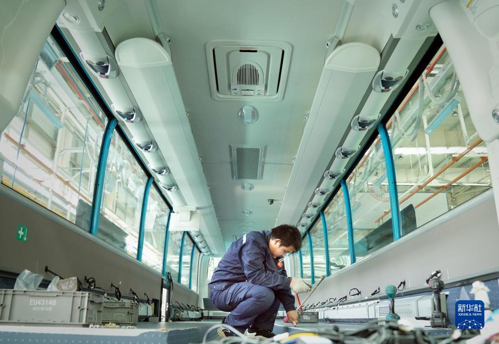 近日,在位于河南省郑州市的宇通新能源厂区高端及海外承装车间里,工作人员在流水线上忙碌地赶订单生产。今年以来,宇通客车海外出口持续走热,相继获得多个海外订单。据介绍,截至目前,宇通客车已远销30多个国家和地区。