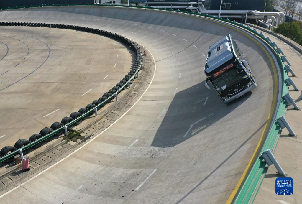 3月8日,一辆客车在宇通新能源厂区试验场内测试(无人机照片)。
