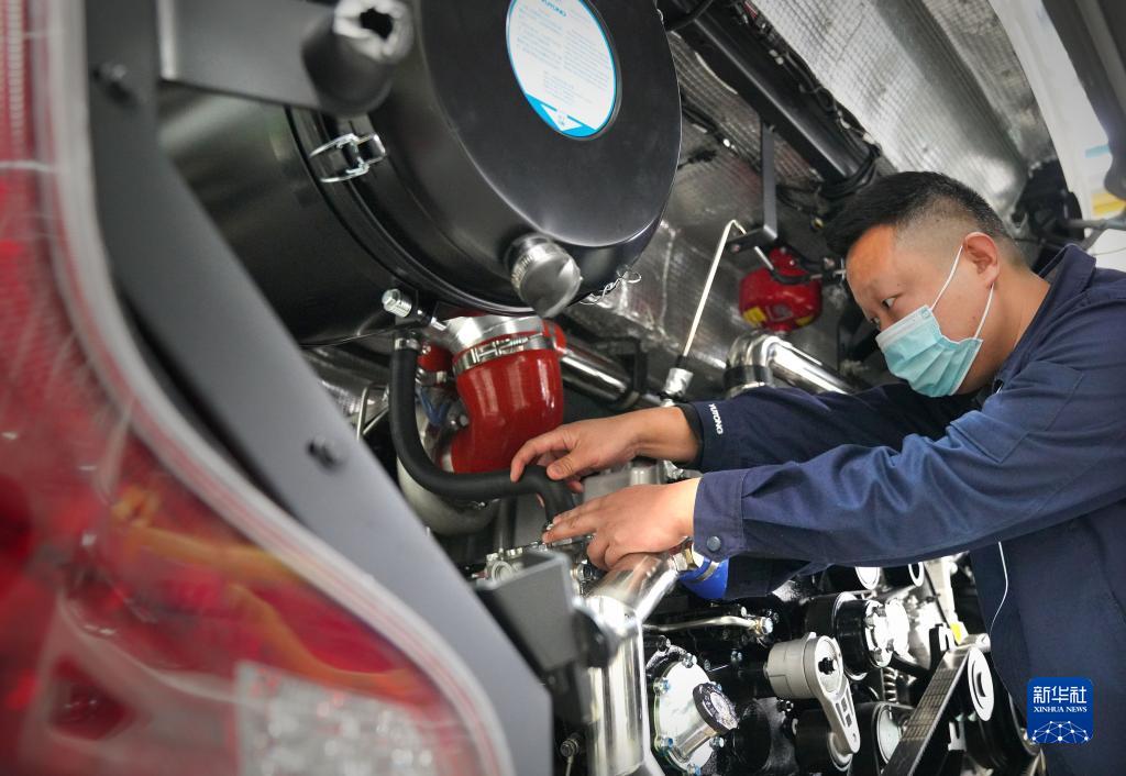3月8日,工作人员在宇通新能源厂区高端及海外承装车间进行发动机检测。