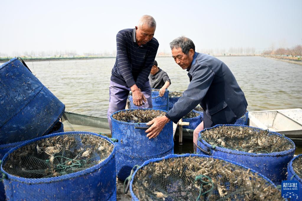 3月9日,在安徽省蚌埠市五河县小圩镇,蟹农准备投放蟹苗。