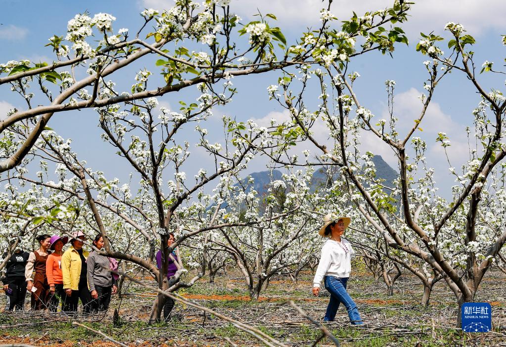近日,广西柳州市融安县潭头乡梨花盛开,吸引游人前来游玩拍照。