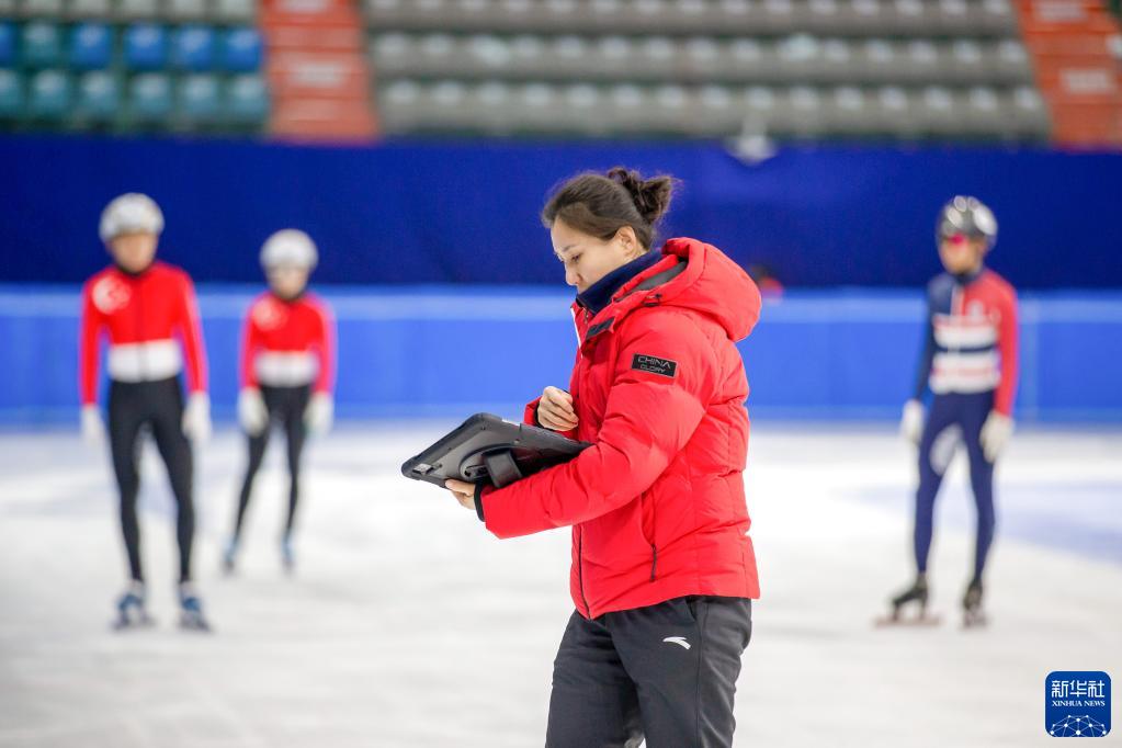 3月9日,中国短道速滑队主教练张晶在现场指导。