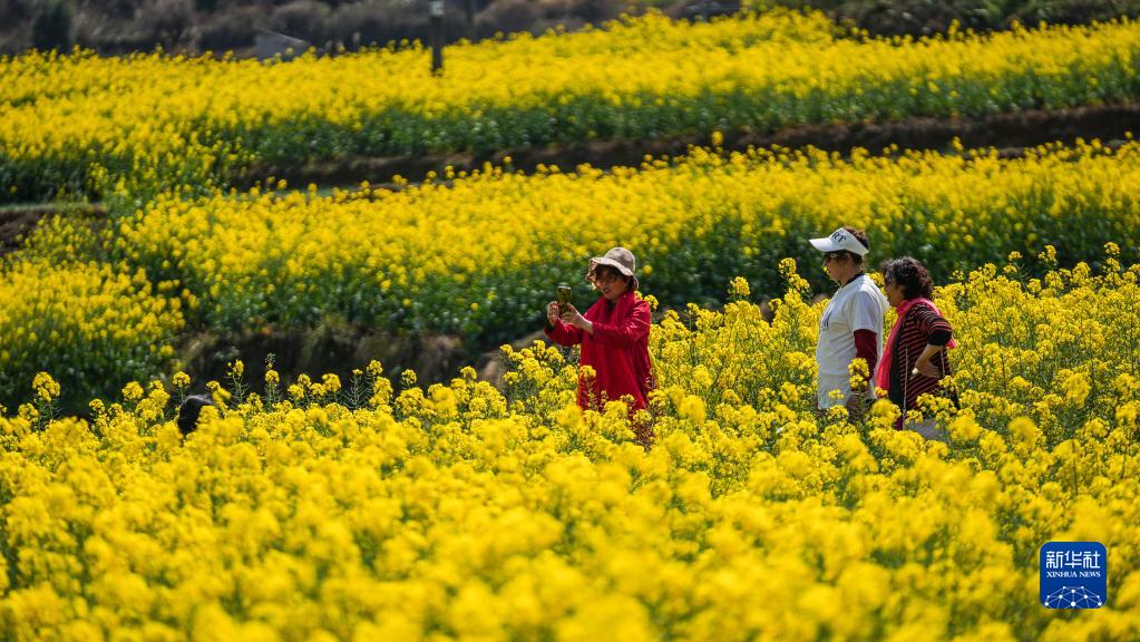 3月9日,游客在贵州省六盘水市六枝特区木岗镇瓦窑村的油菜花田里拍照游玩。