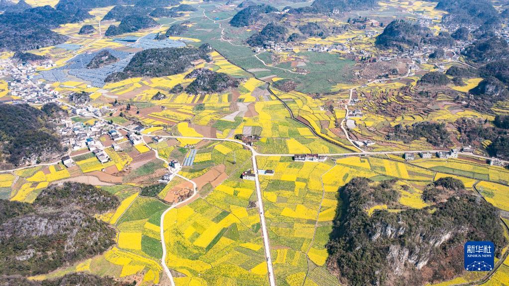 近日,贵州省六盘水市六枝特区木岗镇的16000余亩油菜花竞相绽放,与田地、民居、道路构成了美丽的春日画卷。