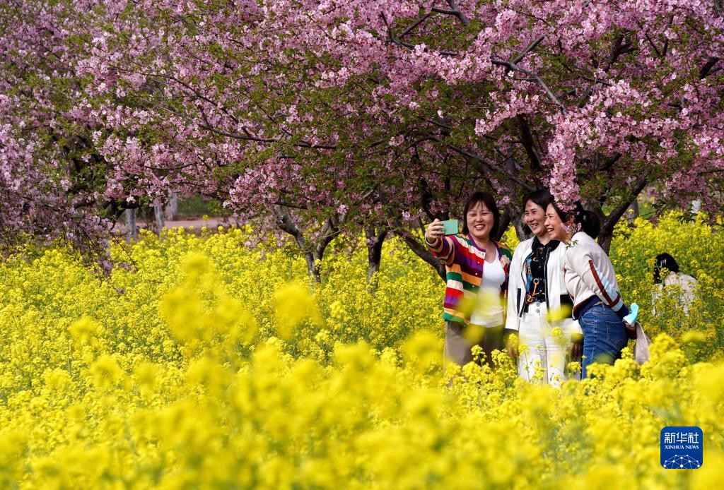 3月10日,市民在荥阳市古柏渡丰乐樱花园内拍照。