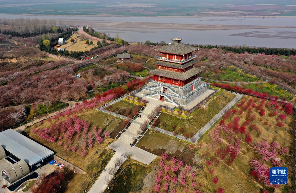 这是3月10日拍摄的位于黄河岸边的荥阳市古柏渡丰乐樱花园(无人机照片)。