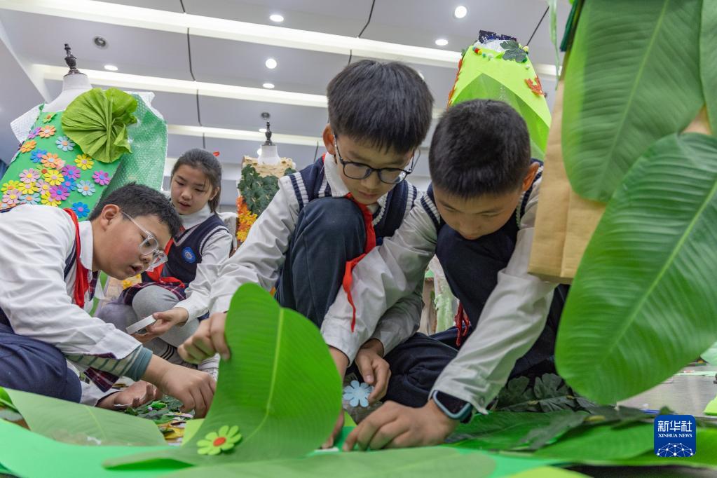 3月10日,重庆市九龙坡区铁路小学的学生们在制作环保服装。