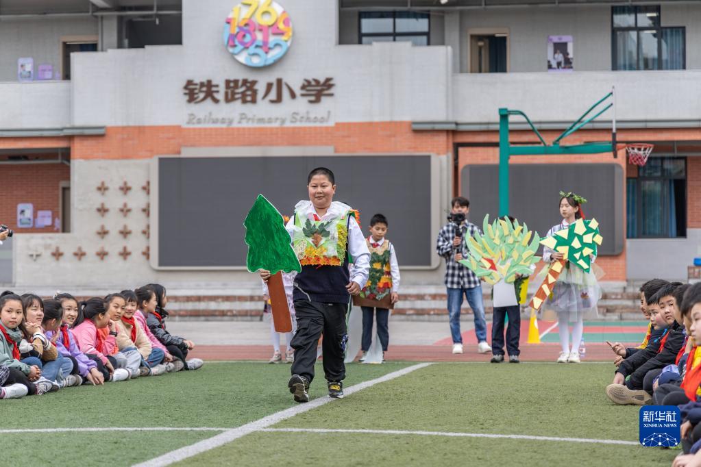 当日,为迎接3月12日“植树节”,重庆市九龙坡区铁路小学组织师生举办“我为世界添片绿”植树节环保系列服装设计展示活动。40余名学生在学校老师和美术义工的指导下,收集身边各种可以利用的废弃物,发挥想象力,制作成环保服装,倡导植绿、爱绿、护绿的生态理念和绿色生活方式。