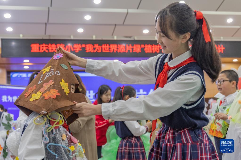 当日,为迎接3月12日“植树节”,重庆市九龙坡区铁路小学组织师生举办“我为世界添片绿”植树节环保系列服装设计展示活动。40余名学生在学校老师和美术义工的指导下,收集身边各种可以利用的废弃物,发挥想象力,制作成环保服装,倡导植绿、爱绿、护绿的生态理念和绿色生活方式。