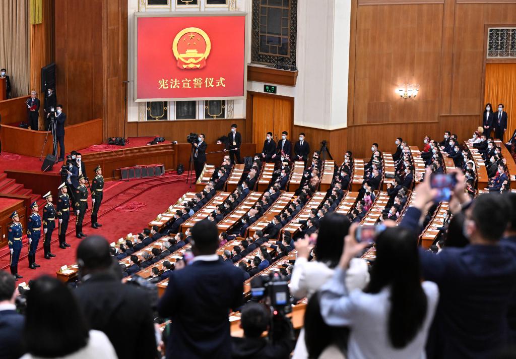 3月10日,十四届全国人大一次会议在北京人民大会堂举行第三次全体会议。全体会议各项议程进行完毕后,举行中华人民共和国第十四届全国人民代表大会第一次会议宪法宣誓仪式。