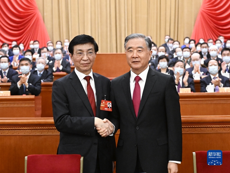3月10日,全国政协十四届一次会议在北京人民大会堂举行第三次全体会议。当会议主持人宣布王沪宁当选政协第十四届全国委员会主席后,汪洋起立祝贺,与王沪宁热烈握手。