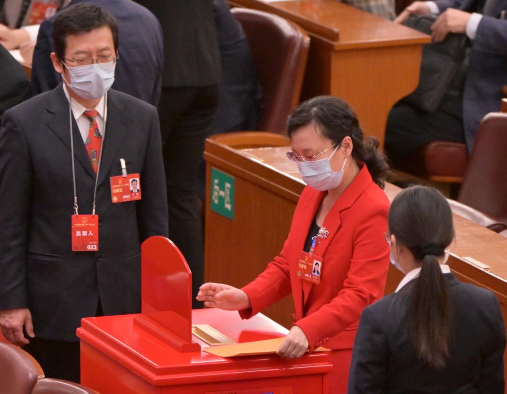 3月11日,十四届全国人大一次会议在北京人民大会堂举行第四次全体会议。这是代表在投票。