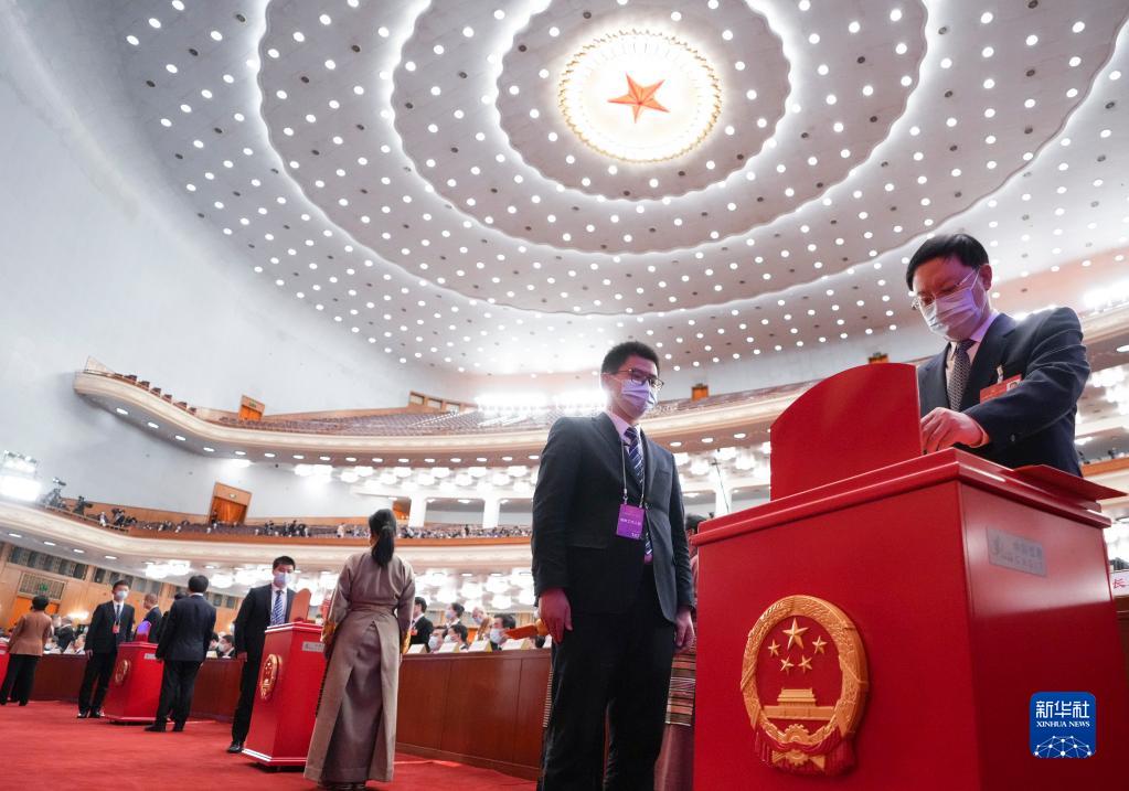 3月11日,十四届全国人大一次会议在北京人民大会堂举行第四次全体会议。这是代表在投票。