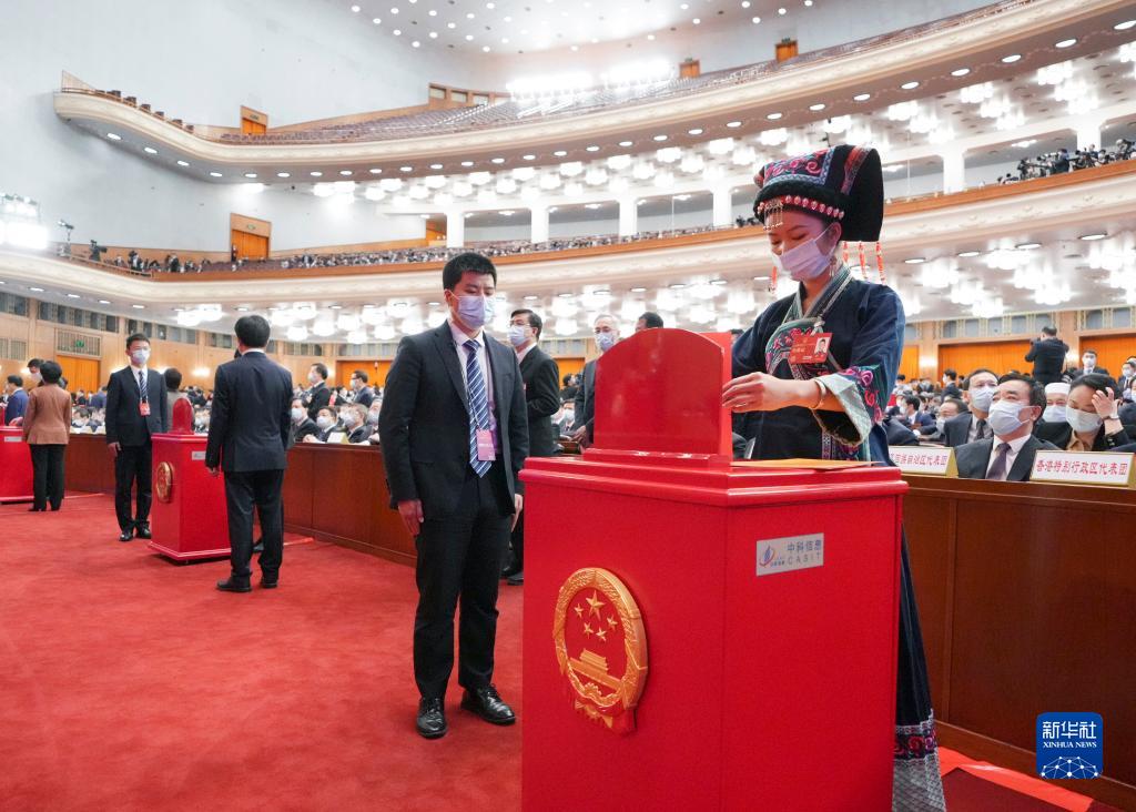 3月11日,十四届全国人大一次会议在北京人民大会堂举行第四次全体会议。这是代表在投票。