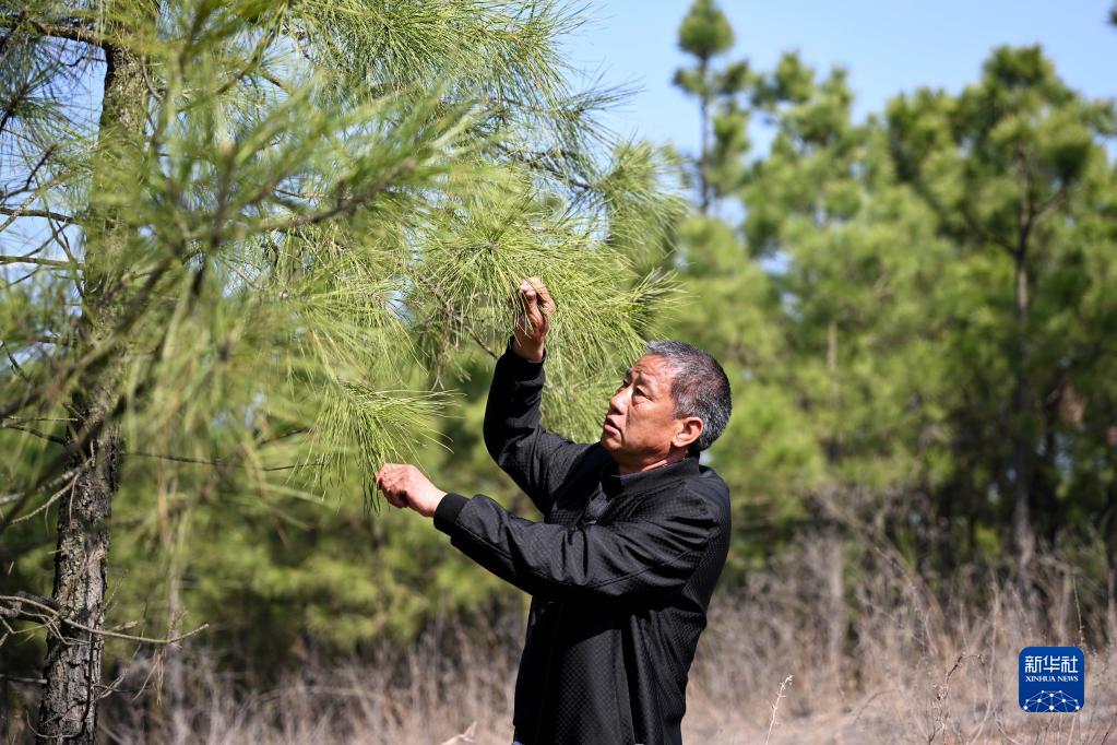 3月10日,在五河县朱顶镇陆冲山的山林中,张伟在检查树木的病虫害情况。