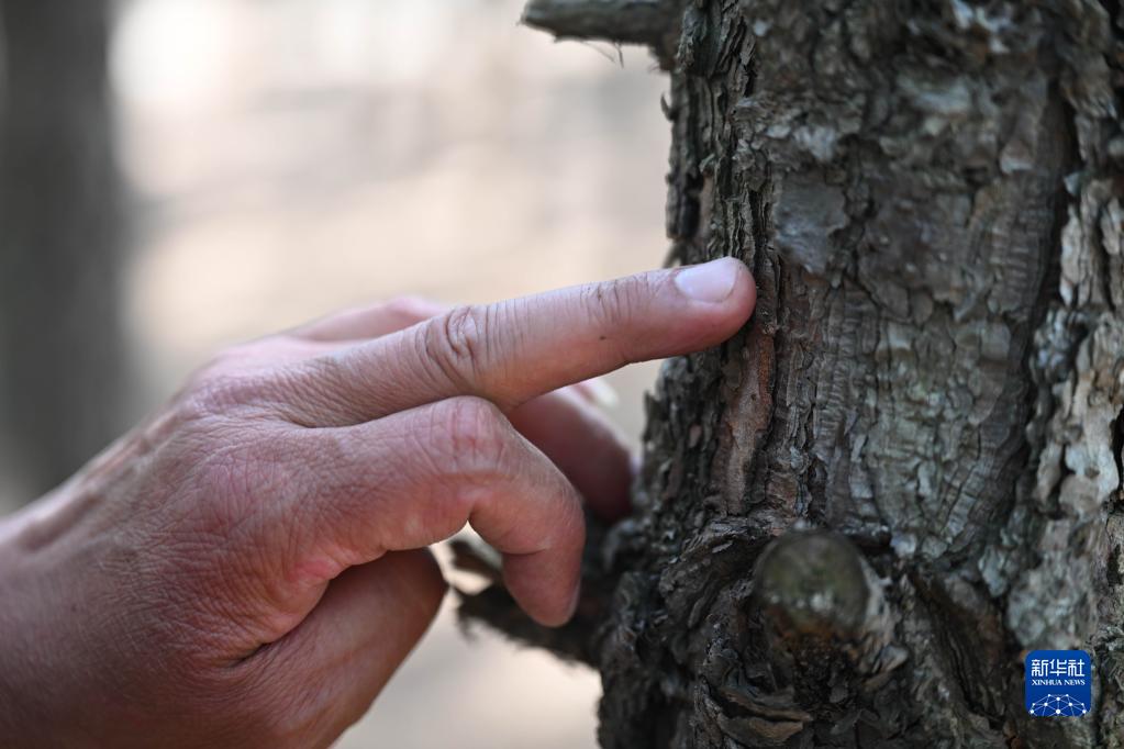 3月10日,在五河县朱顶镇陆冲山的山林中,张伟在检查树木的病虫害情况。