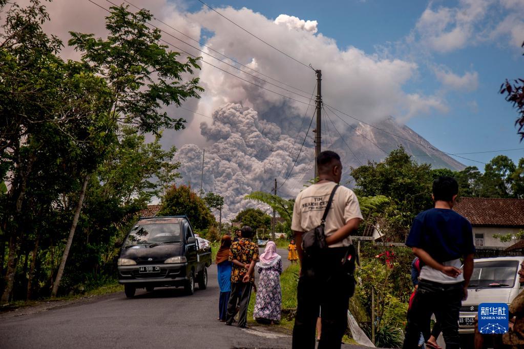 3月11日,在印度尼西亚日惹,人们望向喷发的默拉皮火山。