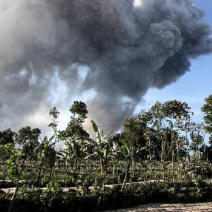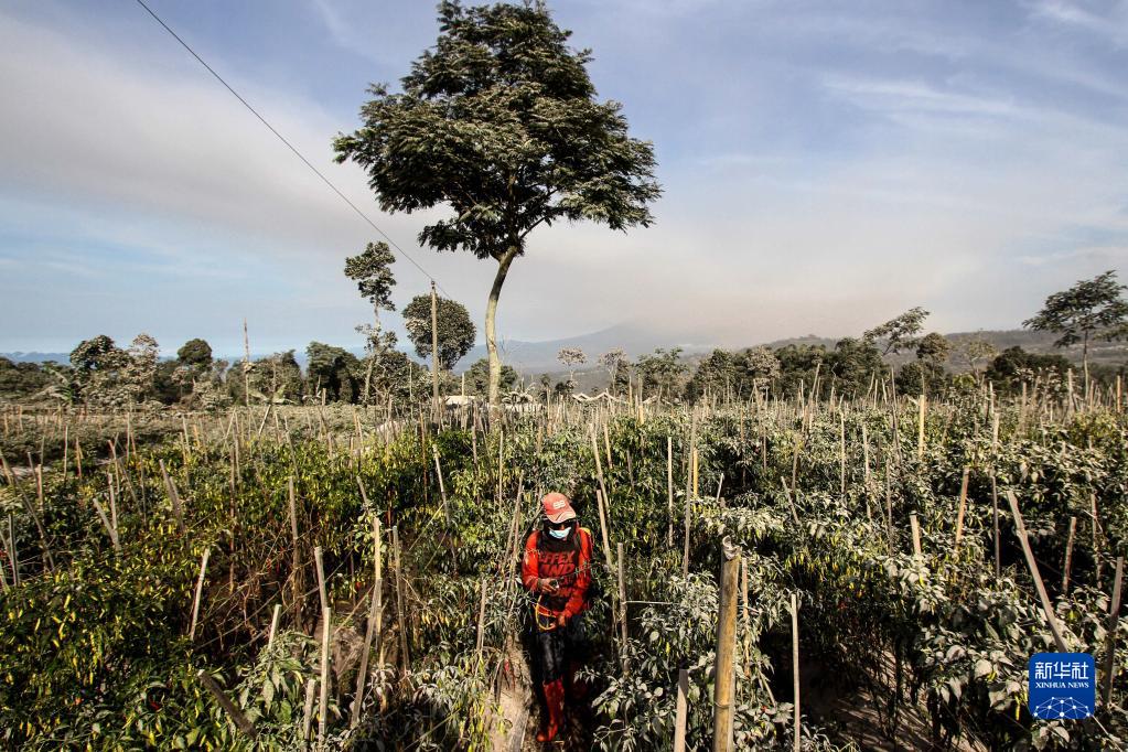 3月12日,在印度尼西亚博约拉利,一名农民向受火山灰影响的辣椒喷水。