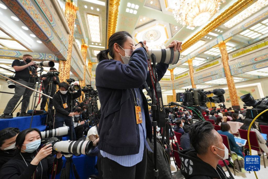 3月13日,十四届全国人大一次会议在北京人民大会堂举行记者会,国务院总理李强出席并回答中外记者提问。国务院副总理丁薛祥、何立峰、张国清、刘国中参加。这是记者在现场采访。