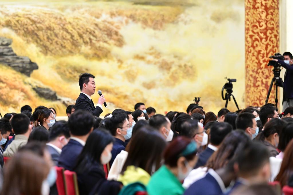 3月13日,十四届全国人大一次会议在北京人民大会堂举行记者会,国务院总理李强出席并回答中外记者提问。国务院副总理丁薛祥、何立峰、张国清、刘国中参加。这是记者在现场提问。