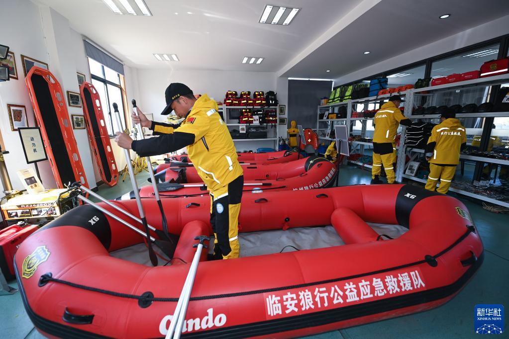 3月14日,临安狼行公益应急救援队的志愿者队员们在训练基地整理救援设备。