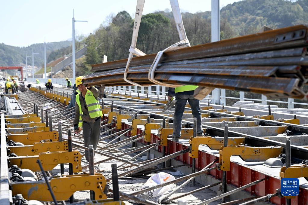 3月14日,在中铁十一局池黄铁路建设现场,工人进行无砟轨道施工作业。
