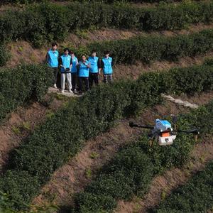 3月14日,在重庆市北碚区天府镇代家村青峰茶场,来自重庆海联职业技术学院无人机专业的学生在练习植保无人机飞防作业。