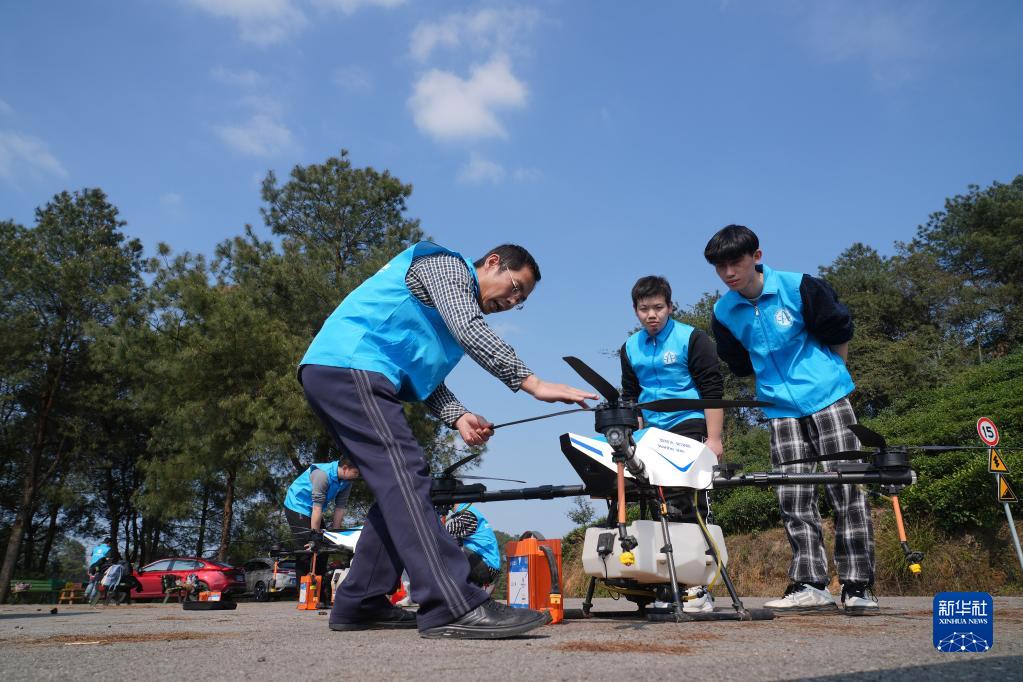 3月14日,在重庆市北碚区天府镇代家村青峰茶场,重庆海联职业技术学院无人机专业教师指导学生进行植保无人机飞防作业前的检查。