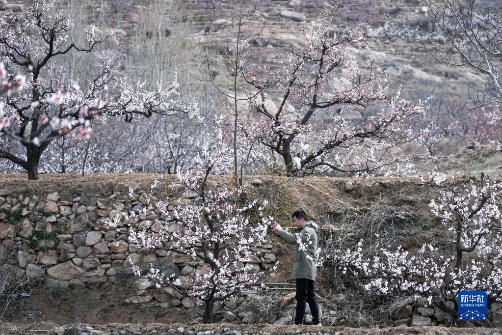 当日,山东省济南市长清区张夏街道近万亩杏花绽放,吸引游客前来观赏游玩。