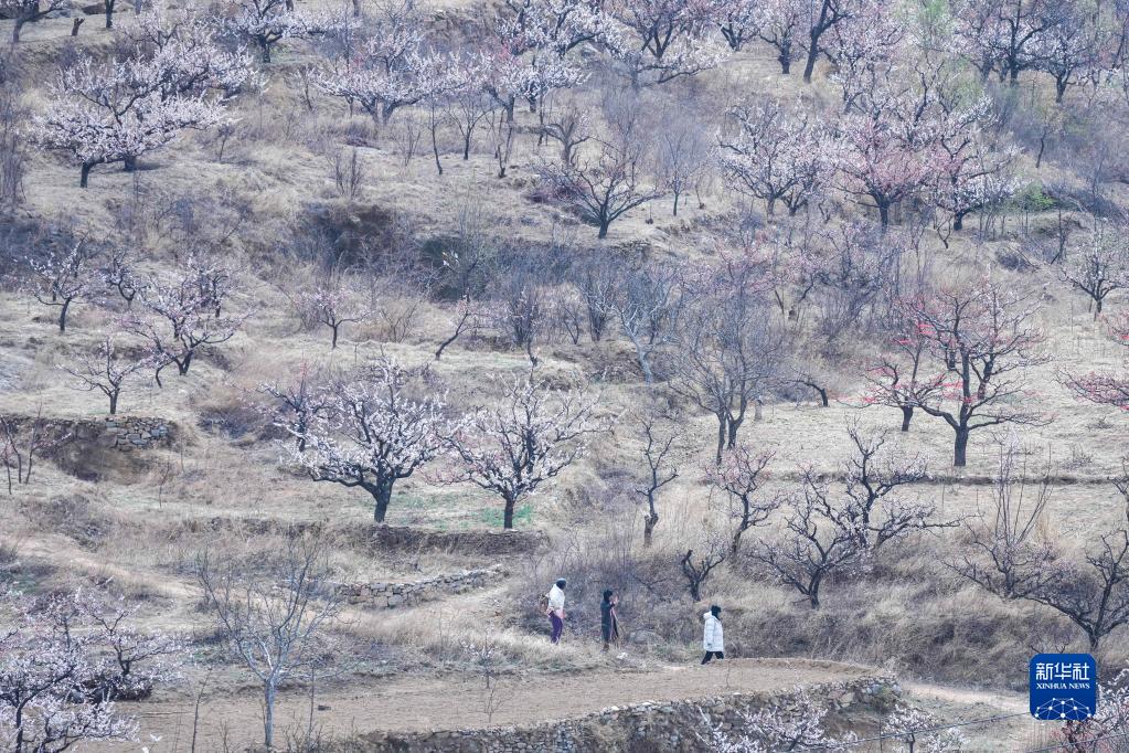 当日,山东省济南市长清区张夏街道近万亩杏花绽放,吸引游客前来观赏游玩。