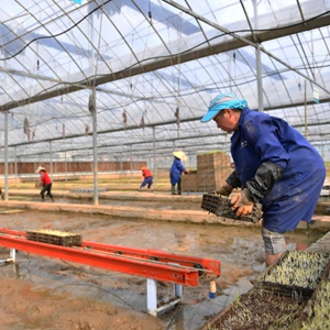 3月15日,在向阳红现代农业智能化集中育秧工厂,农民将早稻秧盘放至循环运动式育秧机上。