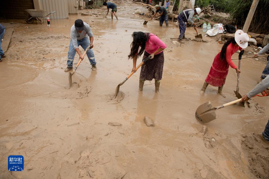 3月15日,在秘鲁首都利马南部的帕查卡马克区,人们清理街道上的淤泥。