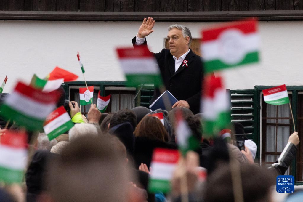 3月15日,在匈牙利小克勒什的裴多菲博物馆前,匈牙利总理欧尔班在集会上发表讲话。