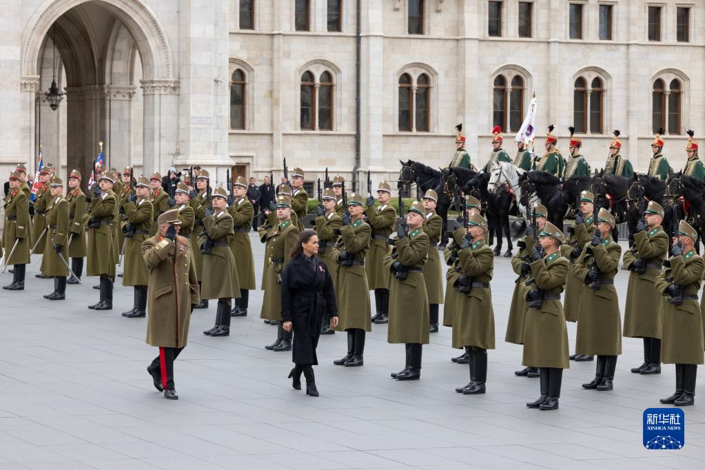 3月15日,在匈牙利布达佩斯国会大厦前的科苏特广场,匈牙利总统诺瓦克·卡塔琳在升国旗仪式上检阅仪仗队。